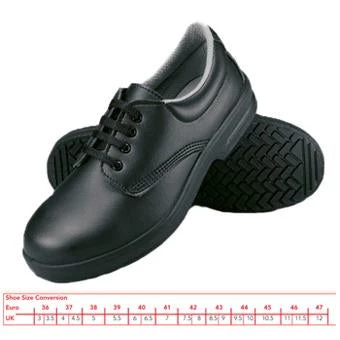 The Denny Black Steel Toecap Safety Shoe is a practical and comfortable shoe to protect chefs feet when working in the kitchen. This pair of lace-up safety shoes have steel toecaps to ensure that any sharp or heavy objects falling in the kitchen will result in minimum damage and injury to the feet.