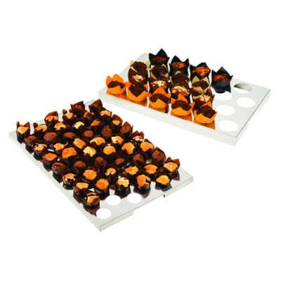 Matfer Stainless Sheet for Tulip Cups are perfect for placing in and removing tulip/muffin cups from the oven. Staggered layout facilitates air circulation for even baking.