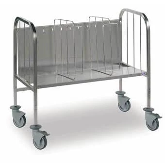 The Bourgeat Stainless Steel Trolley with 2 Dividers is used for the transportation of multiple plates. It is particularly suitable for use in dining halls and canteens where large numbers of plates are to be carried and set on tables. It has 2 dividers which can be fit is 9 possible positions and four 125mm diameter composite wheels, of which two have brakes for stability and safety.