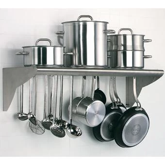 The Shelf Unit with Stainless Steel Utensil Hanging is ideal for use in commercial kitchens to store cooking utensils. It comprises a shelf to hold pots and pans, and hanging bars and hooks to hold ladles, saucepans etc.