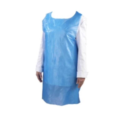 This disposable blue apron is composed of light polyethylene and comes in packs of 100.