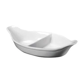 The Genware Divided Vegetable Dish is a boat shaped dish with a middle division allowing for 2 different vegetables to be served from the one dish. This dish can be used in restaurants to serve a mixture of vegetables at the table, or is also ideal for use at home when entertaining guests on special occasions. It is a decoratively shaped dish with raised and gently pointed ends and is available in two different sizes.