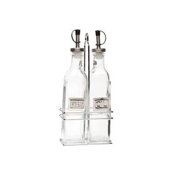 This glass oil & vinegar bottle set features two labelled bottles, one for oil and the other for vinegar, as well as a chrome stand for serving and storing the bottles neatly and safely.