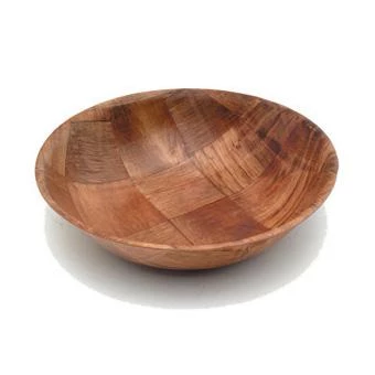 The woven wooden pattern found in these serving bowls is perfect for rustic food presentations such as crusty bread with a bowl of vegetable soup.