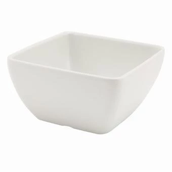 This white melamine curved square bowl is a strong, light and virtually unbreakable bowl which can be used in almost any casual dining setting, but is most commonly used during buffets.
