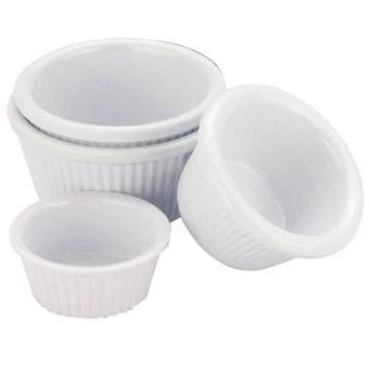 The Zodiac White Melamine Ribbed Ramekin is a small dish which can be used at home or in restaurants to hold dips, sauces and oils. It is made from strong melamine and has a decorative ribbed side design with a thick rounded rim. This ramekin is available in 3 different sizes.