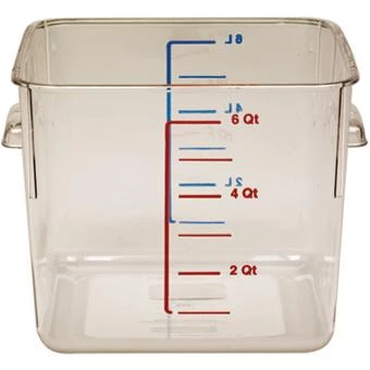 They have measurement gradations marked on the side (red for quarts and blue for litres), strong handles for transportation and drain holes to allow for washing and drying. Made from clear polycarbonate, they are extremely durable and can resist temperatures in the range of -40oC to 100oC.