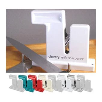 The Chantry Knife Sharpener reproduces the action of a butcher’s steel and automatically ensures the correct edge angle is applied equally to both sides of the blade. The steels revolve under tension and do not wear away the blade.
